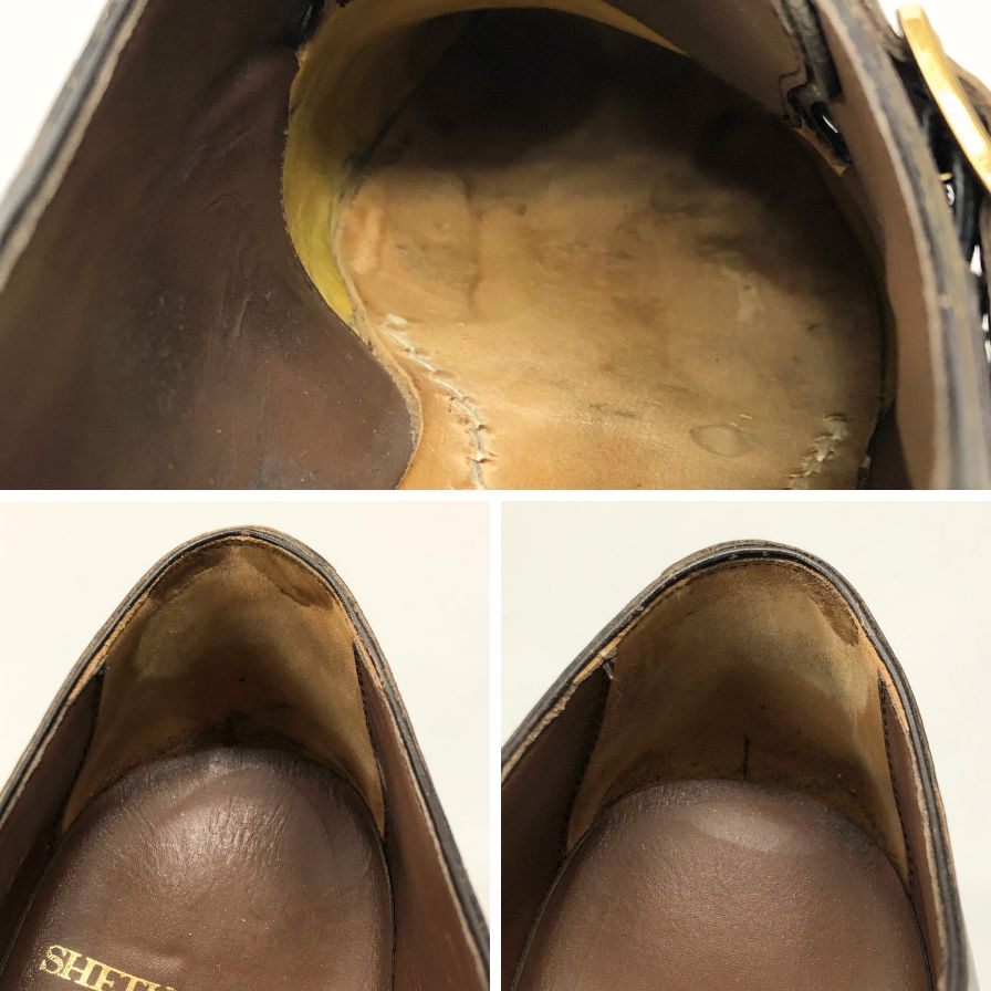 履き皺や小傷(画像参照)が見られます。履きシワ、両側カカトインソール削れ、カカト減り、右足傷、内側シミが見られます。
