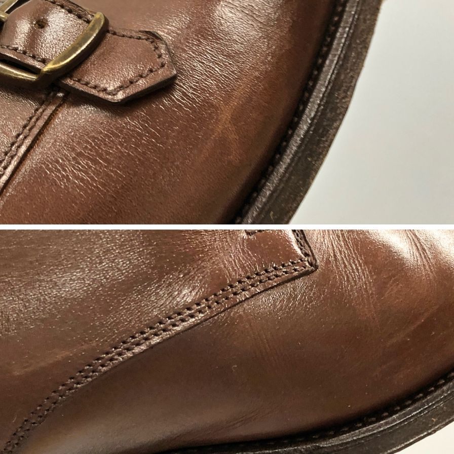 履き皺や小傷(画像参照)が見られます。カカト部分の紐露出、若干のスレ、アウトソールの削れが見られます。